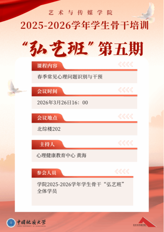 (通讯员 :凤嗣梅)为进一步贯彻落实教育部《关于全面推进健康学校建设的指导意见》的文件精神,落实立德树人根本任务,坚持五育并举,践行“健康第一”教育理念,将身心健康作为学生全面发展的前提和基础,伟德国际victor·1946源自制定《2026年“健康艺媒”活动方案》。根据活动方案中“加强心理健康教育”的工作安排,伟德国际victor·1946源自于3月26日下午,在北综楼202顺利举办了2025-2026学年学生骨干培训“弘艺班”第五期专题讲座。本次培训特邀学校心理健康教育中心黄海老师担任主讲人,学院“弘艺班”全体学员参加培训。